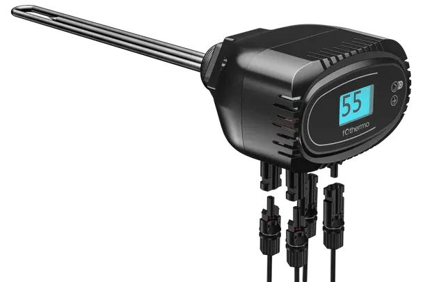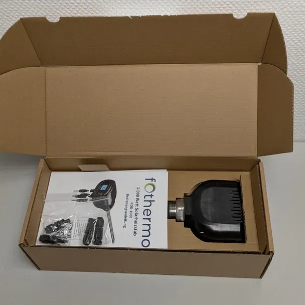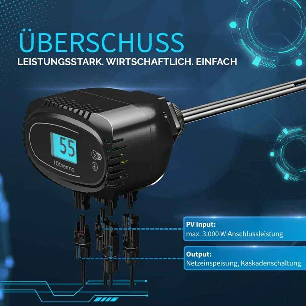 Mit dem Fothermo ROD-1000 nutzt Du Photovoltaikstrom direkt zur Warmwasserbereitung – ohne 230-V-Netzanschluss. Die Heizleistung regelt stufenlos von 0 bis 1.000 W, abhängig von der Modulspannung. Überschüssige Energie kannst Du über den DC-Überschussausgang weiterverwenden (z. B. zweiter Heizstab oder Micro-PV-Wechselrichter).